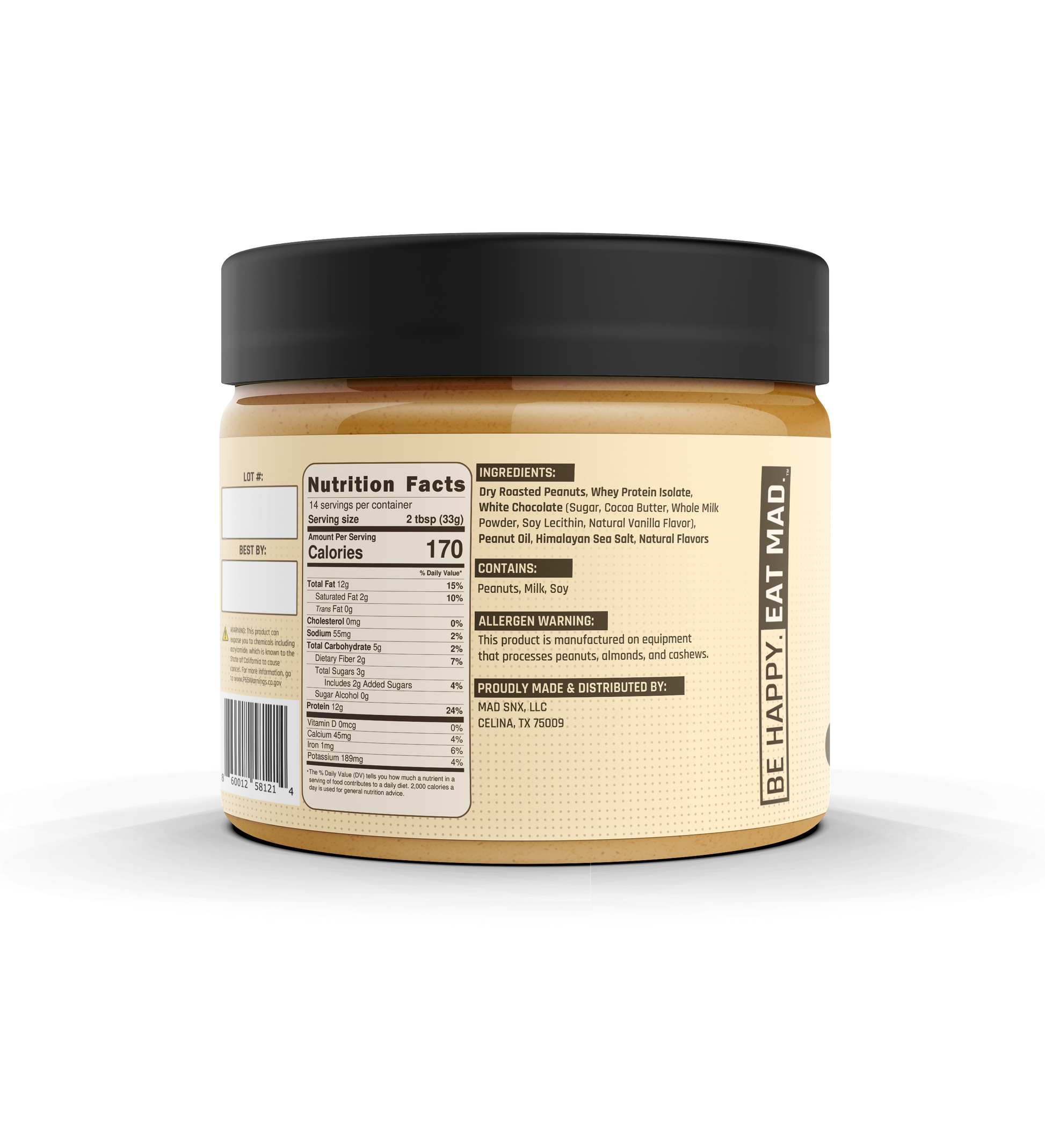 Introducing our High Protein White Chocolate Spread. Crafted with the highest quality dry roasted peanuts, whey protein isolate, and white chocolate. Packed with 12g of protein per serving, Gluten Free, Non-GMO, and No Sugar Alcohols. And super MACRO-FRIENDLY!